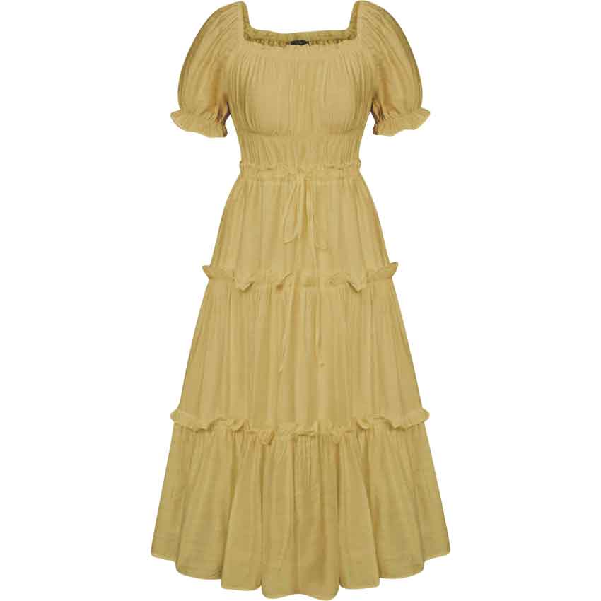 This medieval fantasy dress dress has a multi-tiered, ruffled design. Each tier of the dress has a ruffled line all the way around, gradually flaring out toward the hemline. Its flowing, A-line silhouette and drawstring waist give you a flattering fit.