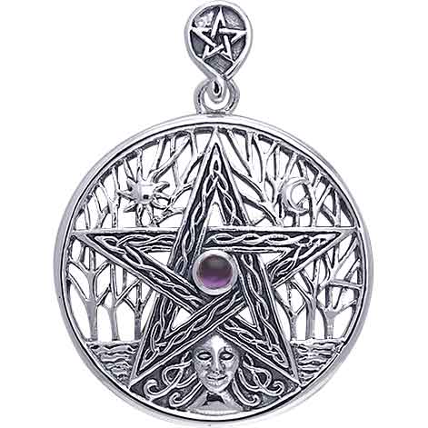 - Displays knotwork pentagram overtop tree, sun, moon, and Mother Earth designs with gem