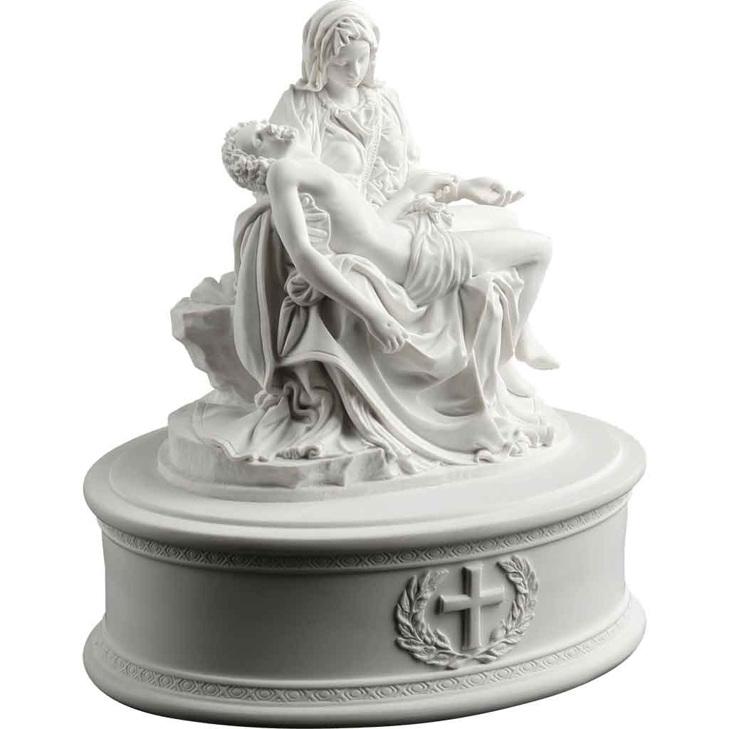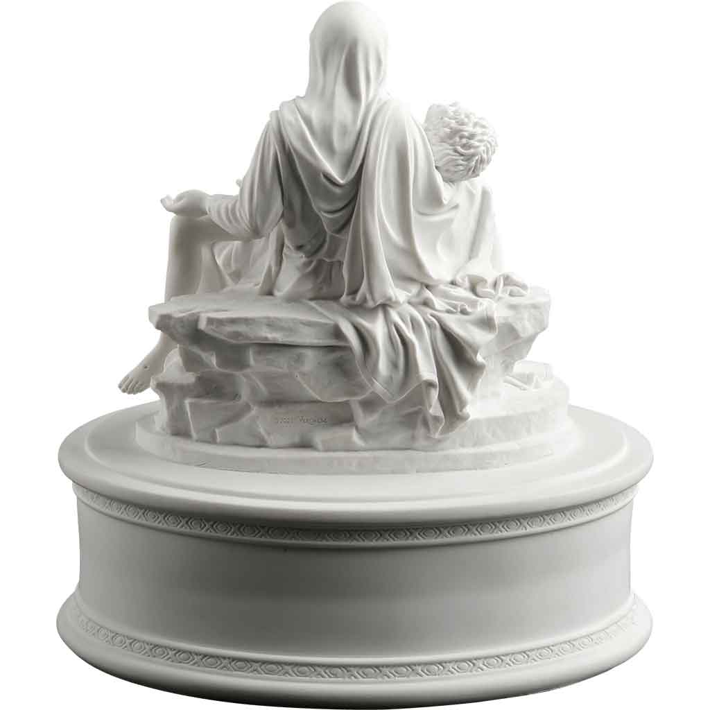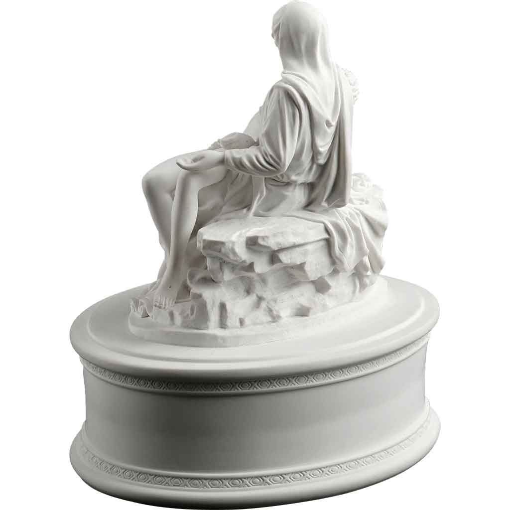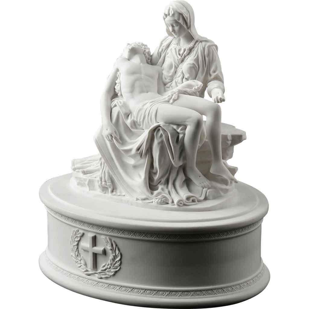The design is inspired by the sculpture known as Pieta, which is also known as “Our Lady of Pity.” Sculpted by Michelangelo Buonarroti, a legendary artist from Tuscany, the Lady of Pity sculpture depicts the Virgin Mary cradling her son Jesus in her arms. This urn is a faithful replica of the centuries-old marble sculpture. Mary is sculpted with her long, flowing robes. A sash with Michelangelo’s signature is reminiscent of the real masterpiece, reading “Michelangelo Buonarroti, the Florentine made this” in Latin. Her and Jesus are on a rocky platform.