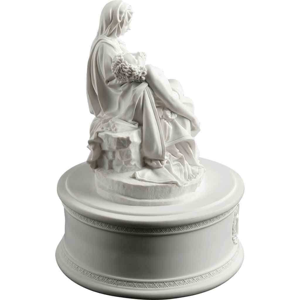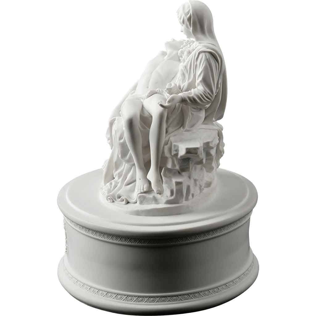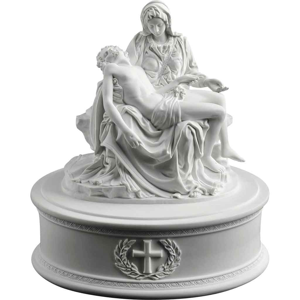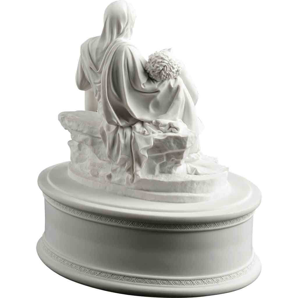The design is inspired by the sculpture known as Pieta, which is also known as “Our Lady of Pity.” Sculpted by Michelangelo Buonarroti, a legendary artist from Tuscany, the Lady of Pity sculpture depicts the Virgin Mary cradling her son Jesus in her arms. This urn is a faithful replica of the centuries-old marble sculpture. Mary is sculpted with her long, flowing robes. A sash with Michelangelo’s signature is reminiscent of the real masterpiece, reading “Michelangelo Buonarroti, the Florentine made this” in Latin. Her and Jesus are on a rocky platform.