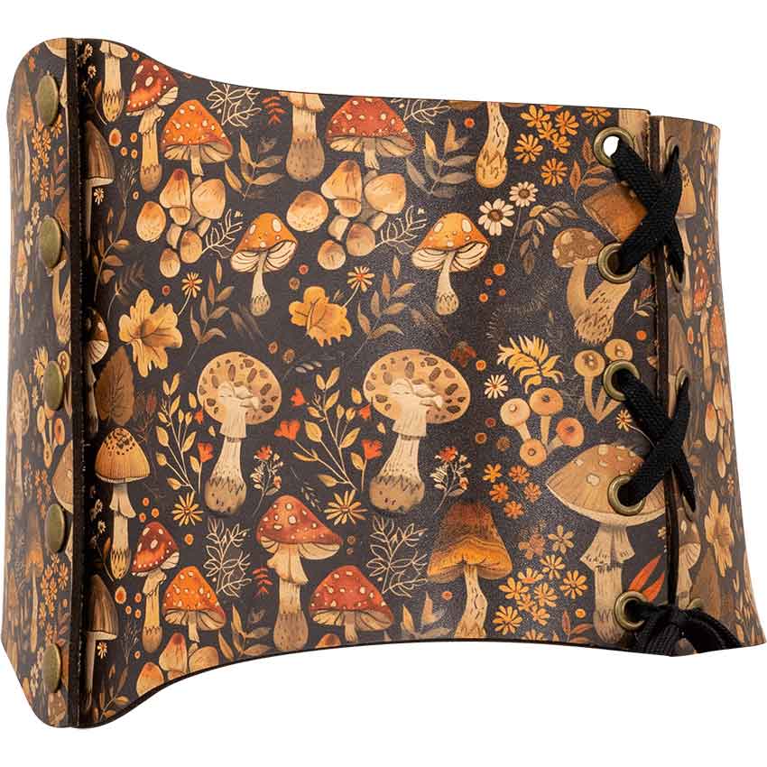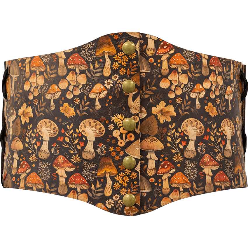 The design depicts mushrooms, flowers, and leaves scattered across a dark brown background. Like the dense undergrowth of a forgotten forest, these natural patterns have unique designs that distinguish them and add layers of detail to the cincher. Various types of mushrooms with different colors thrive between groups of different yellow, red, and white flowers.