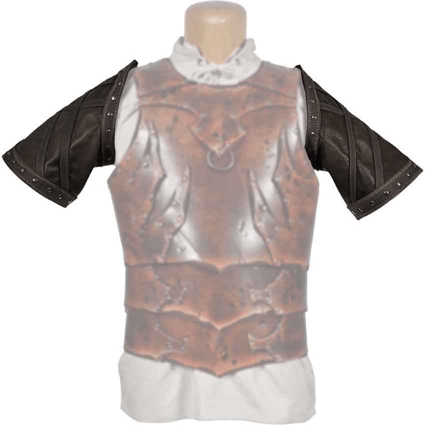 Sold as a pair, the upper arm armour has a roomy fit on most. The sleeves flare out slightly wide. Brown bands of thicker, 5-6 ounce leather frame the leather sleeves. Crisscrossing brown straps of leather add extra detail across their surface.