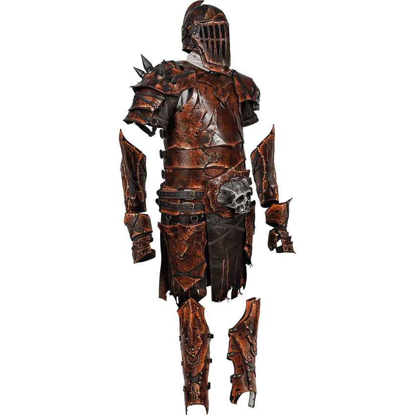 Vegetable-dyed in shades of dark brown, this medieval fantasy armour looks like it wears the evidence of your dark deeds. Intentional slashes, sanding, and varnishing as well as irregularities in the 3-4 ounce leather add to their rugged, battle-tested look. Antique brass-plated rivets reinforce both their structure and battle-tested appearance.