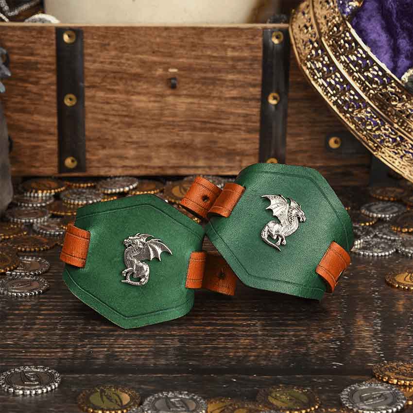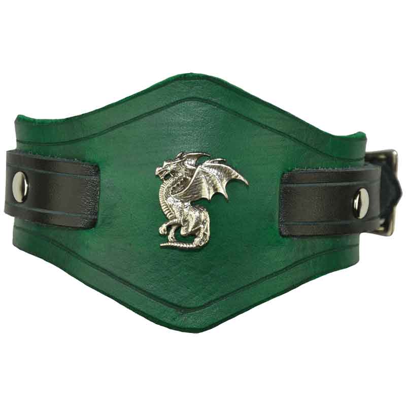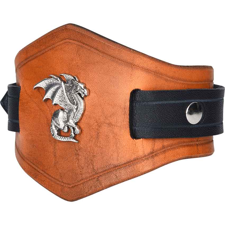 An awesome pair of leather wrist cuffs are a must have accessory for any Fair goer. Our leather wrist cuffs are crafted from medium weight leather and are very comfortable to wear. Attaching to your wrist by a strap and small buckle, these leather wrist cuffs are extremely adjustable and will go as small as needed to fit a child or large to fit an adult. When laid flat, the cuff itself measures 8.5 inches wide and the way the strap is riveted to the cuff is what allows this great adjustability. This wrist cuff features a decorative winged dragon that is quite detailed right down to the scaled belly and tail along with interesting facial features. The dragon faces different ways on each cuff so you can choose to have the dragon looking inwards or outwards depending which arm you wear each wrist cuff on. The wrist cuff measures 3 inches high at the widest part and tapers down to 1.625 inches to perfectly wrap around your wrist. Available in many color combinations. This version comes with steel hardware.