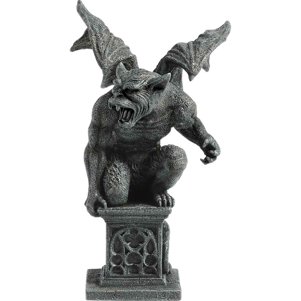 The gargoyle has a snarling head like that of a bat mixed with a dog, complete with realistic fangs, eyes, and wrinkly, leathery skin. With his wings furled behind him, the gargoyle seems ready to take to the skies at any moment. For added detail, the gargoyle’s lion tail wraps around the base.