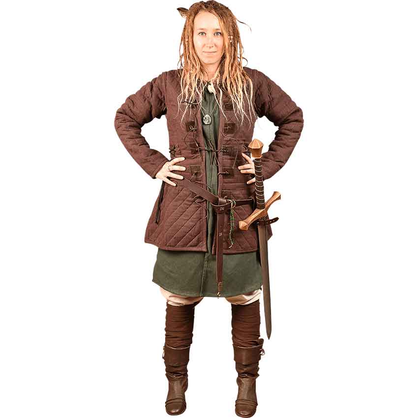 Cunning warrior, you hide in the bushes to spy on the enemy. Wearing the Womens Medieval Scout Outfit, you return to camp with tales of your foes. This fantastic bundle includes arming wear, clothing, and optional items. First, the gambeson, tunic, and pants, come in a range of colors and sizes. This allows you to truly customize your look. To add some great finishing touches to your look, add the optional items. The arm and leg wraps add a rustic aesthetic. Also, the belt makes holding a weapon much easier. Together, they allow you to create a customized medieval or fantasy outfit. Even better, you save 5 percent on all the items when purchasing this bundle. This Womens Medieval Scout Outfit ensemble is wonderful for LARP battles, cosplay events, and reenactments.
