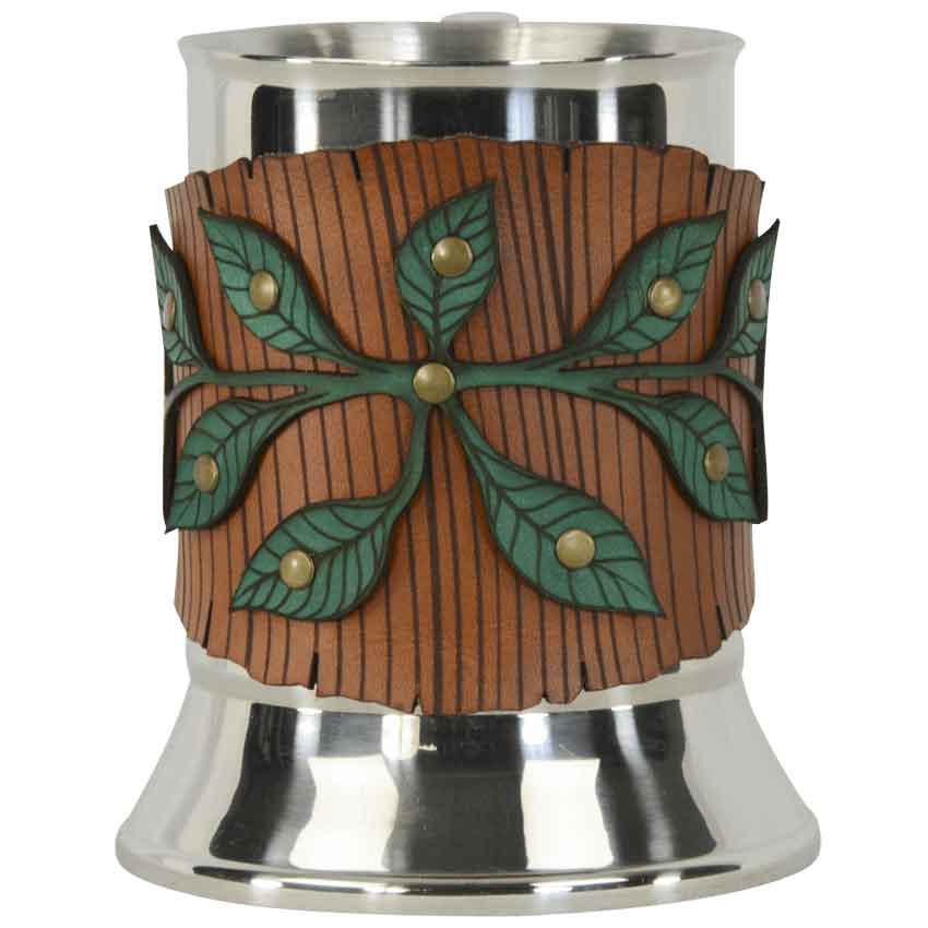 Elven rangers, nature lovers, and Celtic druids will clamor for this Woodland Vine Tankard with Leather Wrap. The handmade wrap displays a woodgrain design, over which is riveted an engraved leafy vine, emulating a vine covered log. Made from 3/4 ounce leather with antique brass hardware in our shop, this leather tankard wrap attaches to the tankard with leather lace. It can and should be removed when the tankard needs to be washed. The Classic Medieval Tankard (CG8915) is included with this leather wrap and holds approximately 0.5 liters of your favorite beverage. Perfect for LARP campaigns, Fairy festivals, Renaissance Faires, or SCA events, the Woodland Vine Tankard with Leather Wrap adds a hint of nature to your next round of toasts.