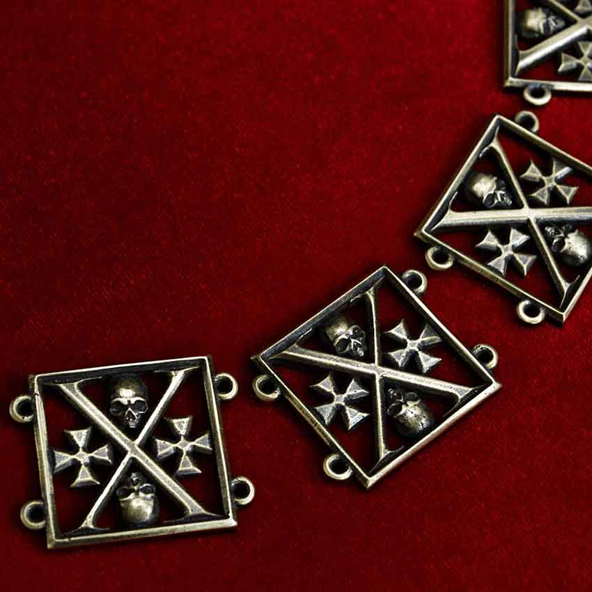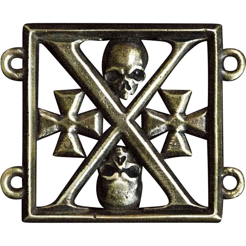 The centerpiece—a square design with a prominent X—reaches each corner. On either side, two intricate crosses accompany the X, while the top and bottom boast skulls counterchanged, adding a touch of enigmatic allure to the design.