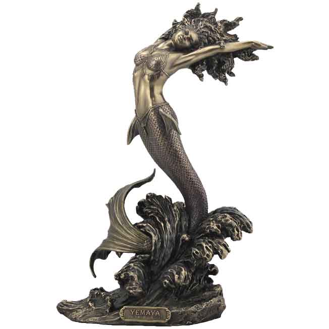 Yemaya is believed to have originated in Nigeria as a river goddess. She is a guardian spirit or orisha, reflecting an aspect of the divine of the Ifa religion. Display Yemaya Goddess of the Ocean Statue in your home. When Yoruba people were taken to the New World, they brought Yemaya with them, and she transformed into the Goddess of the Ocean. She is depicted here as a mermaid and brings comfort and inspiration to those who have been taken far from their homelands. She represents the essence of motherhood and has various forms and names throughout the world. Crafted from cold cast bronze, this Yoruba Orisha statue has been hand-painted to display a lustrous finish. Intricately detailed, her scales and top have been painted a pale purple, contrasting with her golden body and blue waves. Her natural hair is worn loose and her arms stretch upward as she emerges from the water. Well suited for travelers and ocean enthusiasts, this Yemaya Goddess of the Ocean Statue will enhance any beach or aquatic collection.