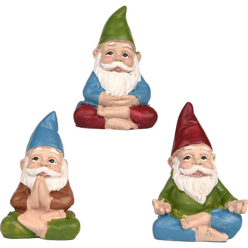 Just like humans, residents of fairy gardens love to practice yoga too. The gnomes depicted in the Yoga Gnome Fairy Garden Statue Trio enjoy yoga. Made from cold cast resin, this hand-painted set includes three statues. Each statue has a different pose and appearance. One gnome has its legs layered on top of each other with its hands resting in its lap. This statue has a blue shirt and red pants. Another gnome has its legs the same way but with a hand on top of each knee. It wears a green shirt and blue pants. The third gnome has its legs crossed on top of each other and has its hands pressed together in front. This gnome wears a brown shirt with green pants. This statue set looks great both outdoors and inside your home or office decor.